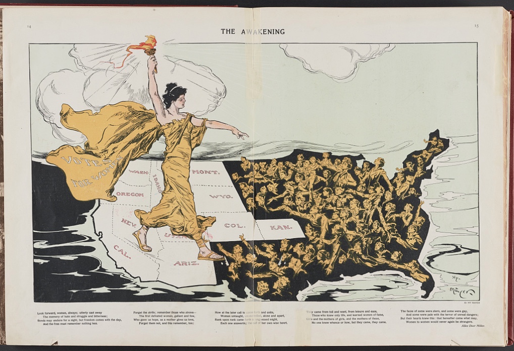 Illustration of women labeled with Votes for Women. Library of Congress.
